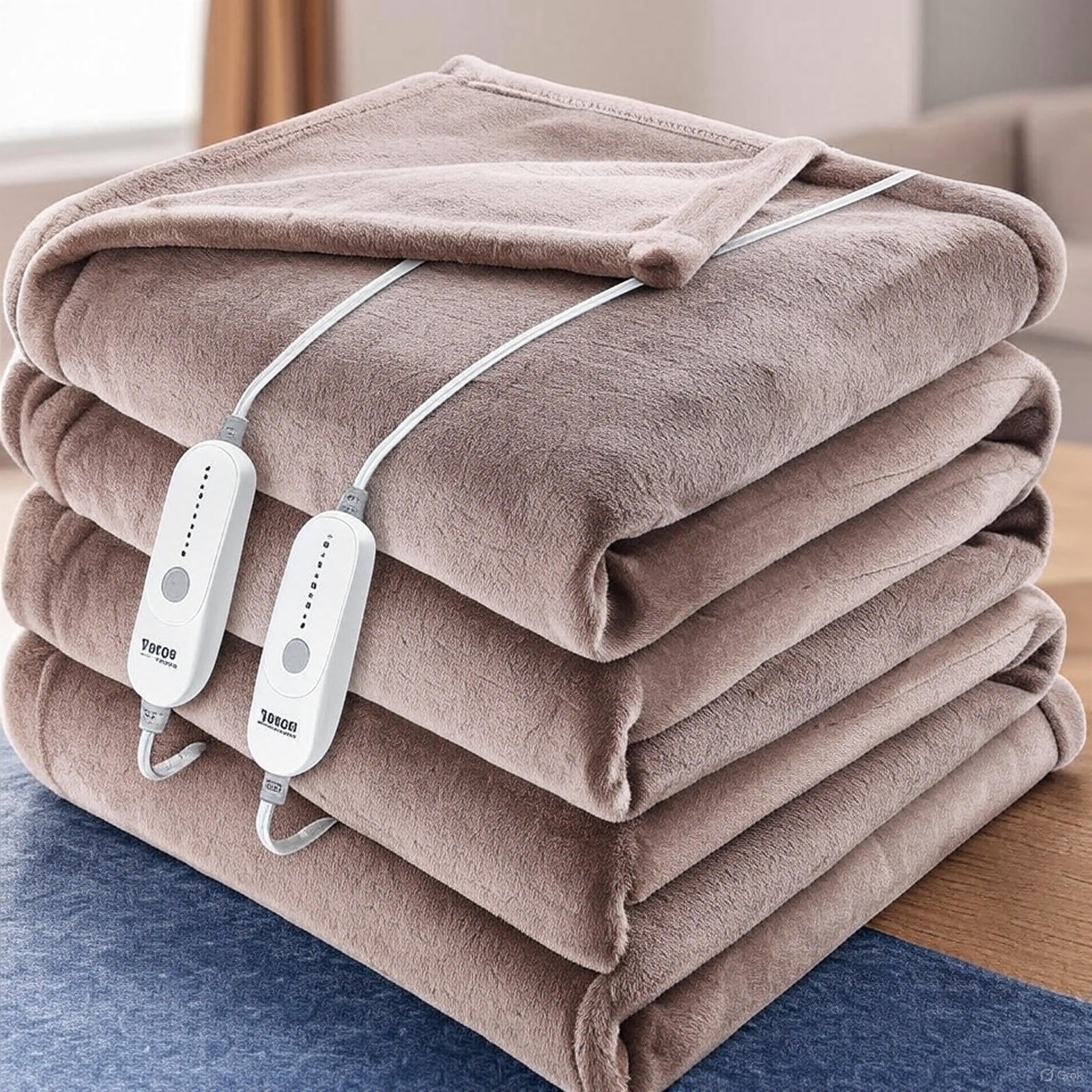 CozyFlame Queen Size Flannel Heated Blanket with Dual Control – Ultra-Soft Beige